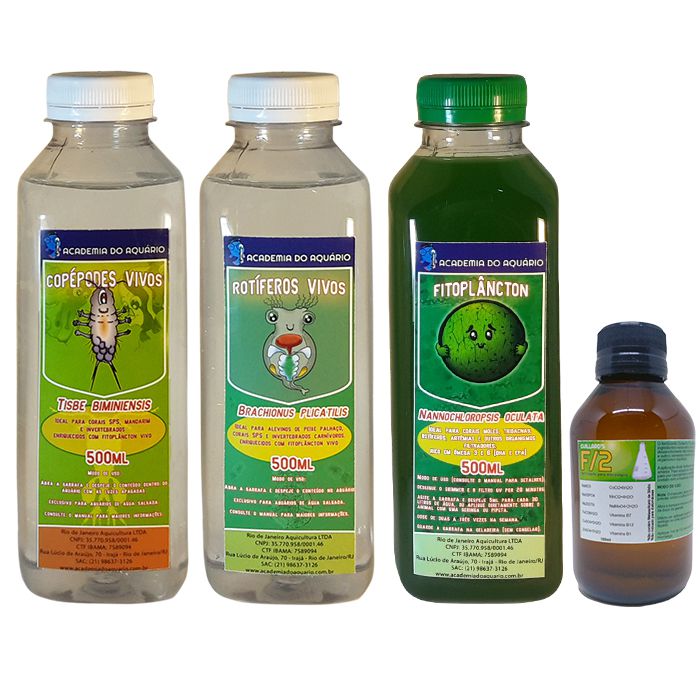 Esse kit contém três espécies de plâncton vivo e o fertilizante necessário para criar todos eles aí mesmo na sua casa. Com apenas algumas potes ou garrafas pets você irá cultivar seu próprio alimento vivo para corais e diversas espécies de peixes de água salgada.